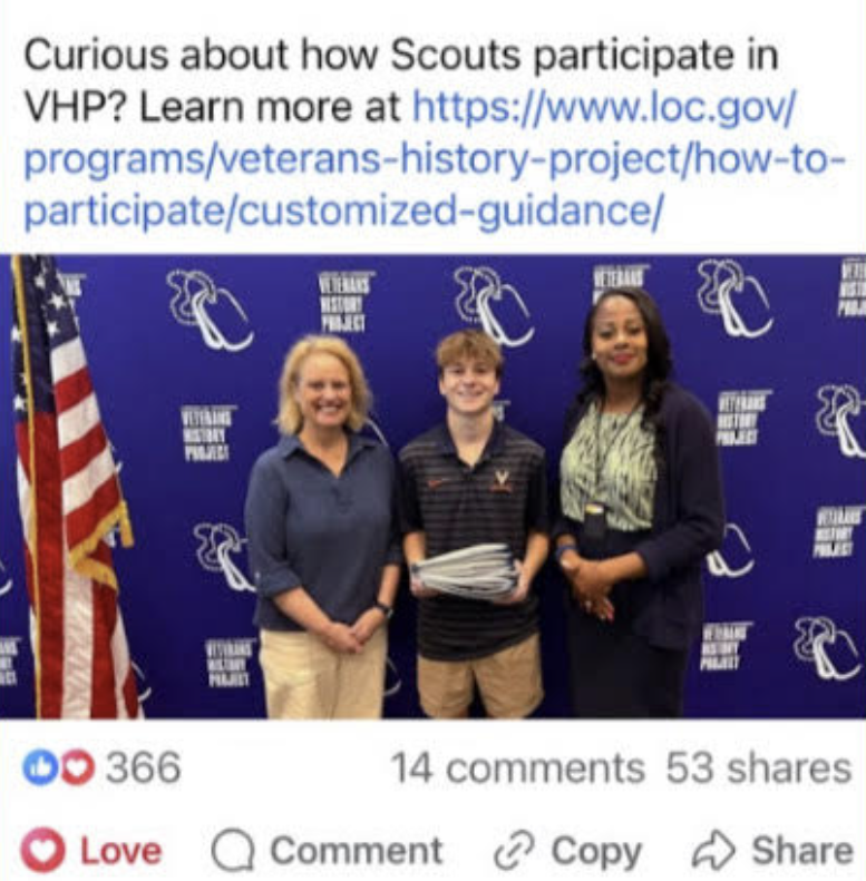 For my Eagle Scout project, I worked with the Veterans History Project at the Library of Congress. I interviewed 10 Veterans and recorded their stories about serving in the military. I submitted the interviews to the Library of Congress so they can be saved and shared with others. This project helps honor Veterans and enables future generations learn from their experiences.